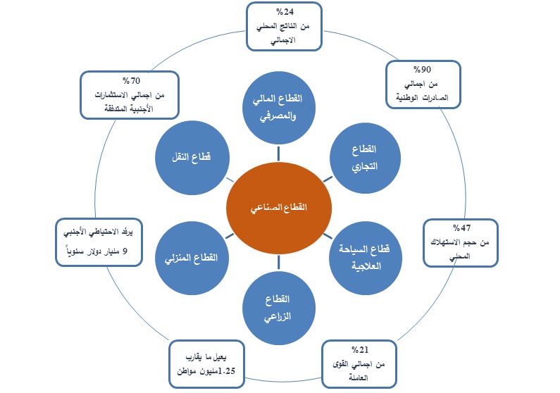 اذ يسهم القطاع الصناعي بحوالي ربع الاقتصاد الوطني بشكل مباشر (25% من الناتج المحلي الإجمالي)، وترتفع هذه المساهمة لتصل الى 40% جراء ارتباطاته الوثيقة مع مختلف القطاعات الاقتصادية وتسببه في زيادة نشاطها.